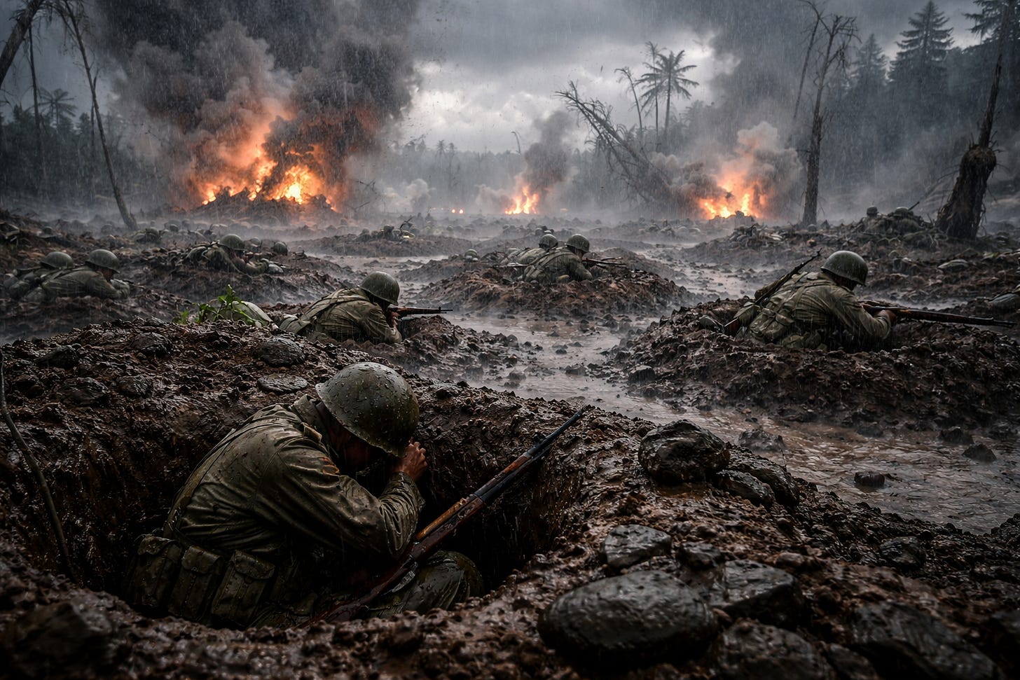 He ran through the mud with his pistol raised, boots slamming into craters still steaming from the bombardment. The jungle that once stood thick and green was now a graveyard of shattered trunks and smoking roots. Men stumbled out of their holes behind him, some screaming, some silent, all running because stopping meant dying. Rain mixed with ash and dirt until it ran down their faces like gray tears. Somewhere ahead, a machine gun cracked to life, its sharp bursts tearing through the ruined field and snapping branches like dry bones. Masters did not slow. He only waved his pistol forward and kept running into the smoke.